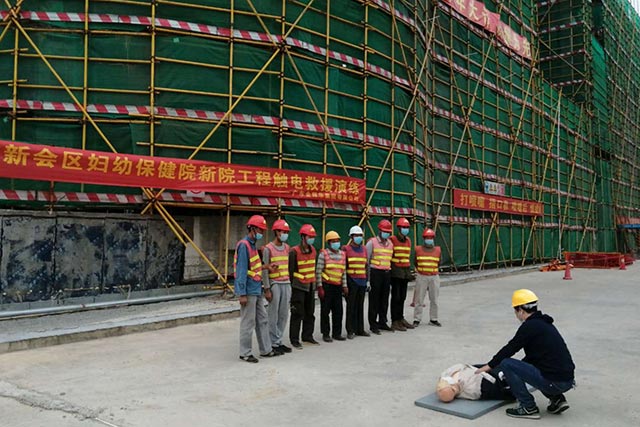 為了保障作業(yè)人員安全和財(cái)產(chǎn)免受損失,加強(qiáng)員工的觸電救援、消防意識,提高意外事故的搶險(xiǎn)救援和自我防范能力,熟悉觸電救援、消防應(yīng)急方法。根據(jù)廣東省市場監(jiān)管局印發(fā)《關(guān)于全力推動市場主體復(fù)工復(fù)產(chǎn)復(fù)市的通知》,結(jié)合防控疫情的形勢,把復(fù)工復(fù)產(chǎn)工作抓實(shí)抓細(xì)抓落地,做到抗擊疫情和經(jīng)濟(jì)發(fā)展兩手抓、兩不誤。2020年4月13日,廣東金輝華集團(tuán)有限公司江門區(qū)域公司在新會區(qū)婦幼保健院新院工地舉行作業(yè)現(xiàn)場應(yīng)急處置演練,主要