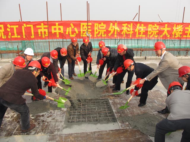 2014年1月6日上午11時(shí),江門中心醫(yī)院外科住院大樓工程舉行封頂儀式,江門市衛(wèi)生局宋華局長(zhǎng)、江門中心醫(yī)院梁伯進(jìn)院長(zhǎng)、我集團(tuán)公司領(lǐng)導(dǎo)張國(guó)球、李甫、盧文權(quán)、張國(guó)勝出席了封頂儀式。江門市衛(wèi)生局宋華局長(zhǎng)在工程現(xiàn)場(chǎng)會(huì)議室首先聽取了江門中心醫(yī)院外科住院大樓功能介紹和施工單位廣東金輝華集團(tuán)有限公司對(duì)目前工程進(jìn)度的簡(jiǎn)單匯報(bào),該工程地下2層,地上26層,建筑面積6.4萬(wàn)平方米。隨后在江門中心醫(yī)院領(lǐng)導(dǎo)和施工單位負(fù)責(zé)