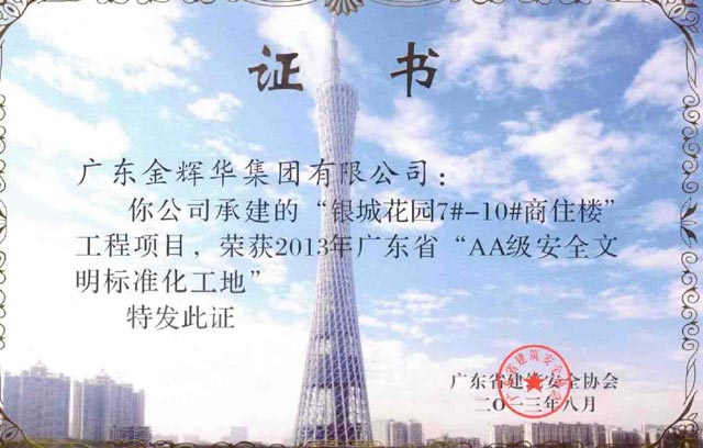 熱烈慶祝我公司“銀城花園7#—10#商住樓”榮獲AA級(jí)安全文明標(biāo)準(zhǔn)化工地。