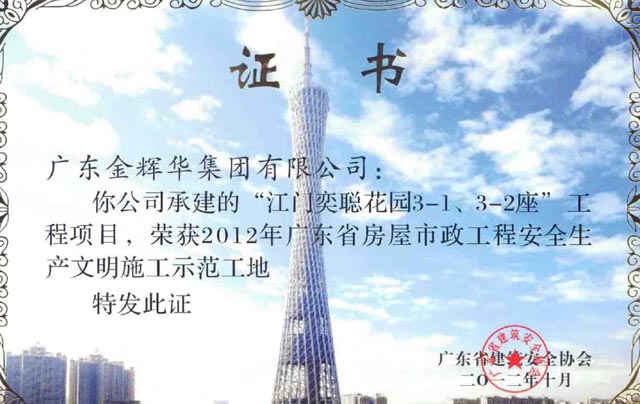 熱烈慶祝我公司“江門奕聰花園3-1、3-2座”榮獲廣東省房屋市政工程安全生產(chǎn)文明施工示范工地。