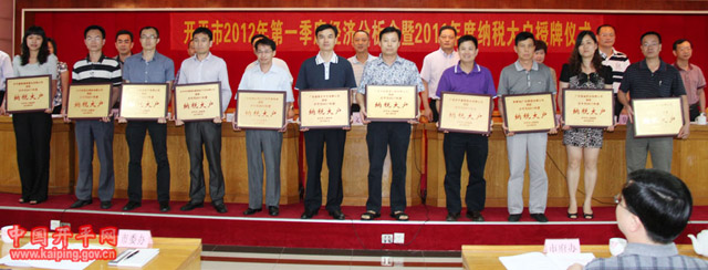 2012年5月7日下午,我司梁國(guó)宏同志代表出席了在開(kāi)平市2012第一季度經(jīng)濟(jì)分析會(huì)暨2011年度納稅大戶(hù)授牌儀式。會(huì)上公布了開(kāi)平市2011年度納稅大戶(hù)的獲獎(jiǎng)名單,其中我集團(tuán)公司等35家納稅超千萬(wàn)企業(yè)分別被授予了“開(kāi)平市2011年度納稅大戶(hù)”的光榮稱(chēng)號(hào),市領(lǐng)導(dǎo)文彥、梁和平、陳偉成等領(lǐng)導(dǎo)均出席會(huì)議并向納稅大戶(hù)授牌。會(huì)議希望被授予稱(chēng)號(hào)的企業(yè),在以后能以發(fā)展為先,以創(chuàng)新為要,爭(zhēng)當(dāng)拉動(dòng)我市經(jīng)濟(jì)發(fā)展的“火車(chē)頭