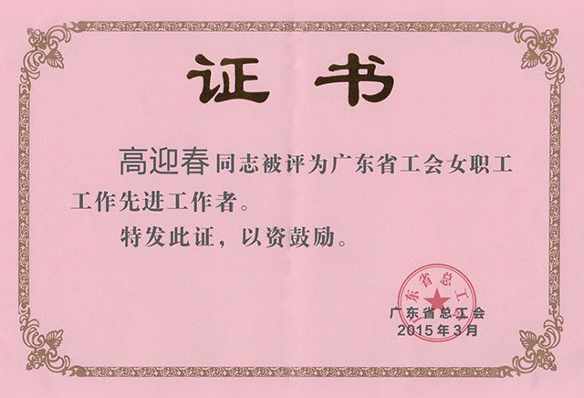 ——記我司工會(huì)副主席高迎春同志被評(píng)為廣東省工會(huì)女職工工作先進(jìn)工作者近日,廣東省總工會(huì)召開了表彰2009-2014年在工會(huì)女職工組織中作出突出成績(jī)的先進(jìn)集體和個(gè)人大會(huì),我司工會(huì)副主席、女職委主任高迎春同志在會(huì)上被授予廣東省總工會(huì)“女職工工作先...